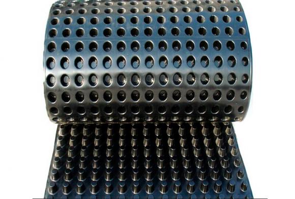 排水板是由聚苯乙烯(HIPS)或者是聚乙烯塑膠底板經(jīng)過沖壓制成圓錐突臺(或中空圓柱形多孔)而成。圓錐突臺的頂面膠接一層過濾土工布,以阻止泥土微粒通過,從而避免排水通道阻塞使孔道排水順暢。傳統(tǒng)的排水方式使用磚石瓦塊作為導濾層、使用較多的鵝卵石或碎石作為濾水層、將水排到指定地點。而現(xiàn)在用排水板取代鵝卵石濾水層來排水則省時、省力又節(jié)能、節(jié)省投資。